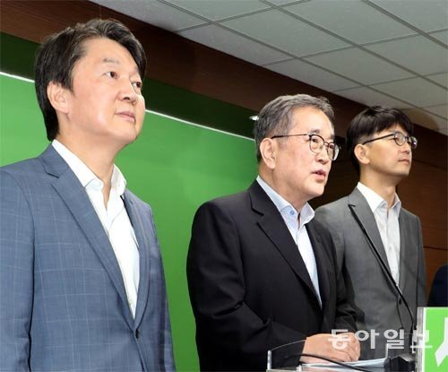 국민의당 안철수 대표(왼쪽)가 10일 제2창당위원회 공동위원장으로 임명된 김태일 영남대 교수(가운데), 오승용 전남대 교수와 함께 기자간담회를 열고 있다. 최혁중 기자 sajinman@donga.com