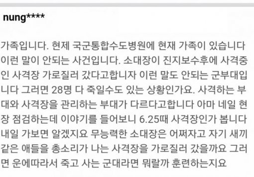27일 관련기사 ‘네이버 댓글’란에서 아이디 ‘nung****’를 쓰는 누리꾼 A씨는 “가족입니다. 현재 국군통합수도병원에 있습니다. 이건 말이 안 되는 사건입니다. 소대장이 진지보수 후에 사격중인 사격장을 가로질러 갔다고 합니다”라고 주장했다.