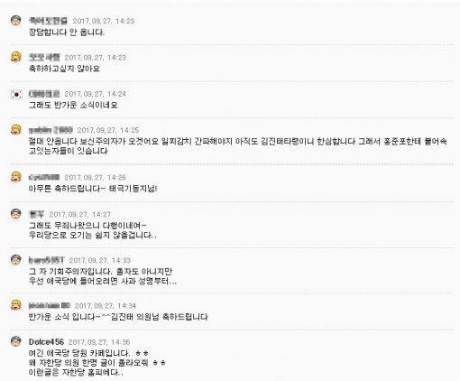 애국당 당원들은 "무죄 선고 받았으니 하루속히 애국당으로 와달라", "장담하는데 안올것이다", "애국진영 한명이 아쉬운 상황인데 기다려보자", "조원진 대표님이 계시다. 배신자는 버려라"등의 엇갈린 반응을 보이고 있다.