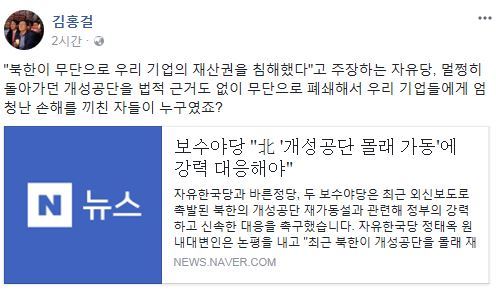 ‘故 김대중 전 대통령 삼남’ 김홍걸 위원장은 “보수야당 ‘北 개성공단 몰래 가동에 강력 대응해야’”라는 제목의 기사를 공유하면서 이같이 밝혔다.