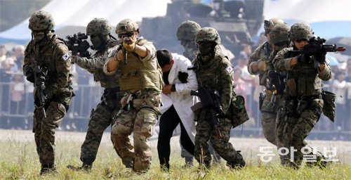 8일 충남 계룡대 비상활주로에서 열린 ‘제15회 지상군 페스티벌’에서 한미 특전사 대원들이 테러 진압과 피해자 이송 시범을 보이고 있다. 12일까지 계속되는 지상군 페스티벌에서는 육군의 첨단 무기를 관람하고 직접 체험해볼 수 있다.