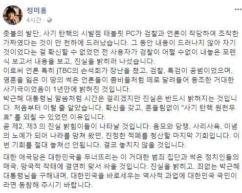 정 대표는 9일 자신의 페이스북에 "촛불의 발단, 사기 탄핵의 시발점 태블릿 PC가 검찰과 언론이 작당하여 조작한 가짜였다는 것이 만 천하에 드러났다"고 글을 올렸다.