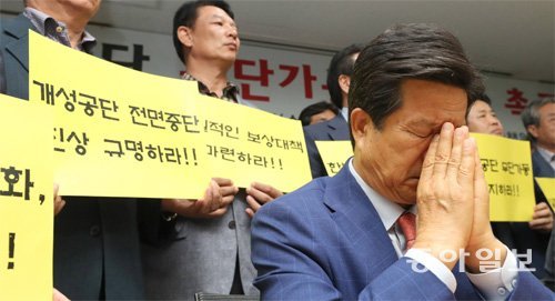 개성공단기업 비상대책위원회의 문창섭 공동위원장이 11일 서울 여의도 중소기업중앙회에서 열린 기자회견에서 두 손을 모은 채 참석자들의 발언을 듣고 있다. 비대위는 이날 북한의 개성공단 시설 무단 사용을 확인하기 위해 정부에 방북 승인을 요청하겠다고 밝혔다.