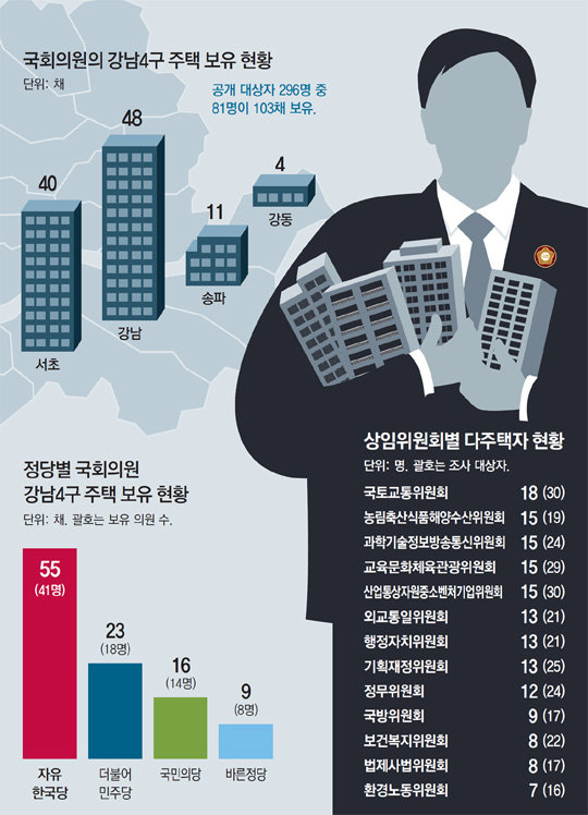 이들이 강남4구에 보유한 주택은 모두 103채로 국회의원들이 보유한 총 주택 522채의 19.7%였다. 지역별로는 강남구 48채 서초구 40채, 송파구 11채, 강동구 4채다.