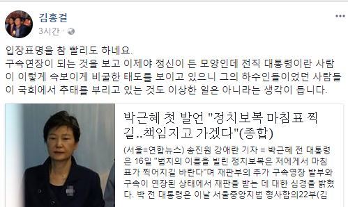 김 위원장은 이날 자신의 페이스북에 "입장표명을 참 빨리도 하네요. 구속연장이 되는 것을 보고 이제야 정신이 든 모양인데 전직 대통령이란 사람이 이렇게 속보이게 비굴한 태도를 보이고 있으니 그의 하수인들이었던 사람들이 국회에서 추태를 부리고 있는 것도 이상한 일은 아니라는 생각이 듭니다"라고 글을 올렸다.