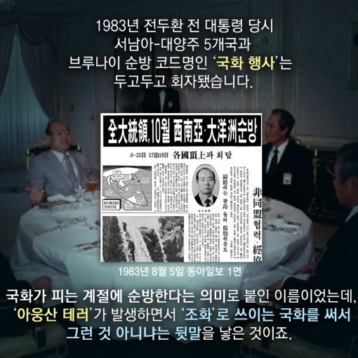 1983년 전두환 전 대통령 당시 서남아-대양주 5개국과 브루나이 순방 코드명인 ‘국화 행사’는 두고두고 회자됐습니다. 국화가 피는 계절에 순방한다는 의미로 붙인 이름이었는데요. 아웅산 테러가 발생하면서 ‘조화’로 쓰이는 국화를 써서 그런 것 아니냐는 뒷말을 낳은 것이죠.
