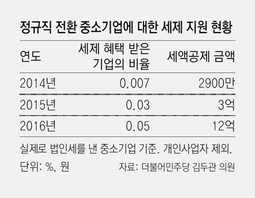 비정규직을 정규직으로 전환하는 중소기업에 세금을 깎아주고 있지만 정작 이를 활용해 실제로 지원을 받은 곳은 납세 기업의 0.1%에도 못 미친 것으로 나타났다.