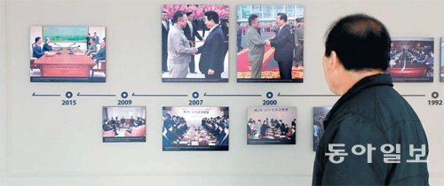 1층에 전시된 남북 정상 및 장관급 회담 사진들을 한 시민이 보고 있다. 2015년 8월 ‘2+2’ 남북 고위급 접촉을 마지막으로