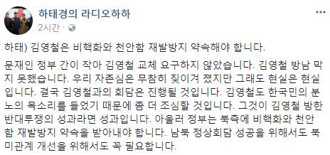 하 의원은 “우리 자존심은 무참히 짖이겨 졌지만 그래도 현실은 현실이다”며 “결국 김영철과의 회담은 진행될 것이다. 김영철도 한국민의 분노의 목소리를 들었기 때문에 좀 더 조심할 것이다. 그것이 김영철 방한 반대투쟁의 성과라면 성과다”고 썼다.
