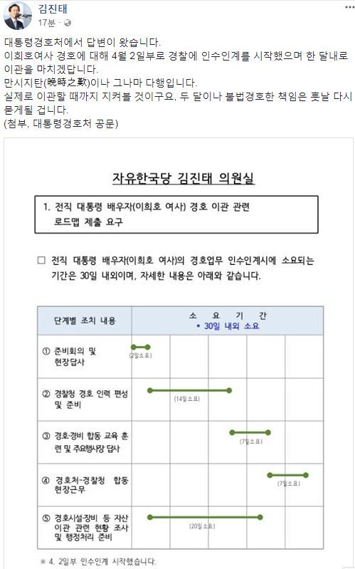 이 여사에 대한 경호를 즉각 중단하라고 요구해 온 김진태 의원은 이날 오전 페이스북을 통해 경호처의 공문을 공개하며 "대통령경호처에서 답변이 왔다. 이희호 여사 경호에 대해 4월 2일부로 경찰에 인수인계를 시작했으며 한 달내로 이관을 마치겠다 한다"고 전했다.