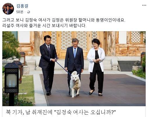 김홍걸 의장은 이날 자신의 페이스북에 “북 기자, 남 취재진에 ‘김정숙 여사는 오십니까?’”라는 제목의 기사를 공유하면서 이같이 밝혔다.