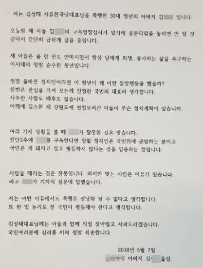 김 씨의 아버지는 7일 언론사에 보낸 글을 통해 “어떤 이유에서도 폭행은 정당화될 수 없다고 생각한다”면서도 “법 논리도 전 국민이 평등해야 한다고 생각한다”고 밝혔다.