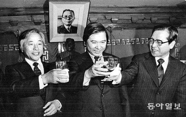 ‘서울의 봄’ 인촌기념관의 3金 1980년 2월 ‘서울의 봄’을 맞아 일민 김상만 당시 동아일보 회장의 초청으로 서울 종로구 계동 인촌기념관에 모여 건배를 하고 있는 ‘3김’. 왼쪽부터 YS, DJ, 그리고 JP.