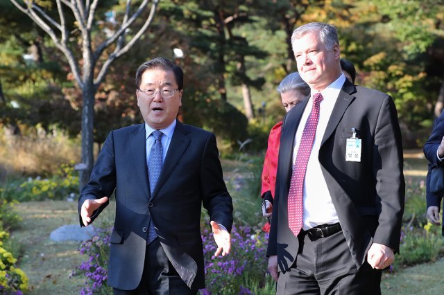 그러면서 “정 실장과 비건 대표는 ‘비건 대표와 한국 정부 관계자들과의 의견 교환으로 한미간 상호 입장을 더욱 깊이 있게 이해하고 양국 공조관계를 더욱 굳건하게 한 것’으로 평가했다”고 전했다.