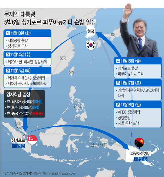 문재인 대통령이 13일 한·아세안(ASEAN·동남아시아국가연합) 정상회의, 아시아태평양경제협력체(APEC) 정상회의 참석을 위해 싱가포르·파푸아뉴기니 순방길에 올랐다.