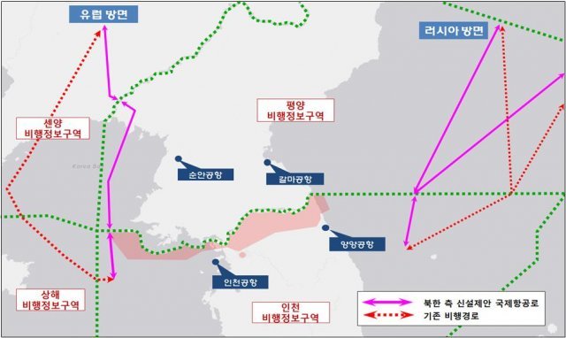 국토교통부와 통일부에 따르면 북한은 16일 개성 남북 공동연락사무소에서 열린 남북 항공 당국 간 실무회의에서 동·서해에 새로운 항로를 연결하자고 제의해 왔다.