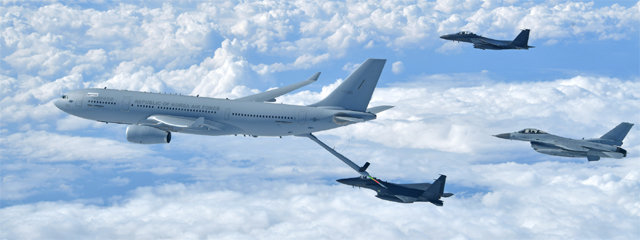 지난해 11월 도입된 한국 공군의 첫 공중급유기 ‘KC-330’이 30일 김해 공군기지에서 정경두 국방부 장관 주관으로 열린 전력화 행사를 기점으로 실전배치됐다. 공군은 올해 말까지 공중급유기 총 4대를 도입한 뒤 2020년 7월부터는 정상작전을 수행할 수 있게 한다는 계획이다. 사진은 KC-330이 우리 공군 주력 전투기 F-15K에 공중 급유하는 모습.