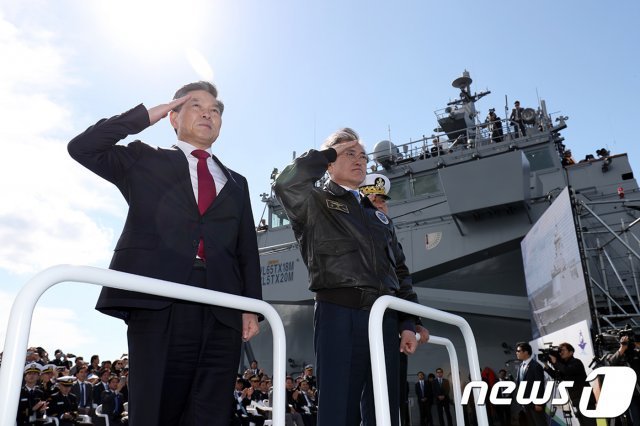 문재인 대통령이 지난해 10월 제주 서귀포시 민군복합항 앞바다에서 열린 2018 대한민국 해군 국제관함식에 참석해 일출봉함에서 해상사열을 하고 있다. (청와대 제공) 2018.10.11/뉴스1