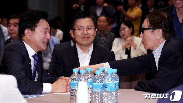 27일 오전 서울 중구 태평로 한국프레스센터 국제회의장에서 열린 대한민국 위기극복 대토론회에서 원희룡 제주도지사(왼쪽부터), 황교안 자유한국당 대표, 박찬종 전 의원이 대화를 나누고 있다. ‘야권통합과 혁신의 비전’을 주제로 한 이날 토론회는 종합토론 후 통합과 혁신을 위한 우리의 결의 선언문을 발표한다. 2019.8.27/뉴스1 © News1