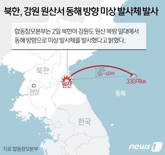 합동참모본부는 2일 북한이 강원도 원산 북방 일대에서 동해 방향으로 미상 발사체를 발사했다고 밝혔다.