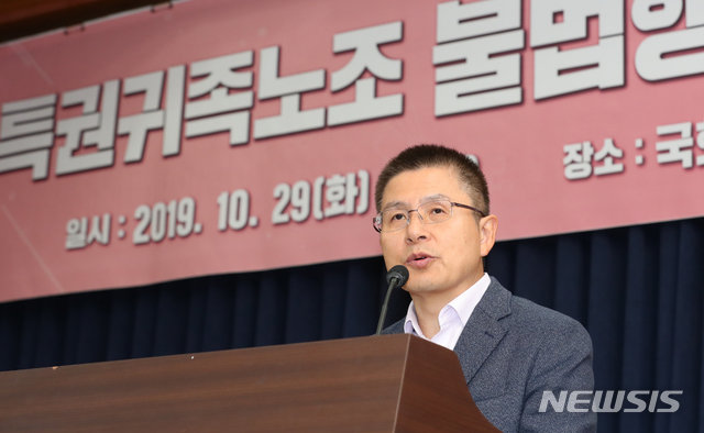 황 대표는 29일 오전 국회에서 열린 한국당 주관의 ‘특권귀족노조 불법행위 및 법 경시 풍조 대책 세미나’에 참석해 “(민주노총이) 스스로 자임하기를 문재인 정권이 탄생할 수 있도록 뒷받침했고 그래서 그 공을 나눠야 한다고 생각하고 있는 게 아니냐는 지적도 있다”고 말했다.