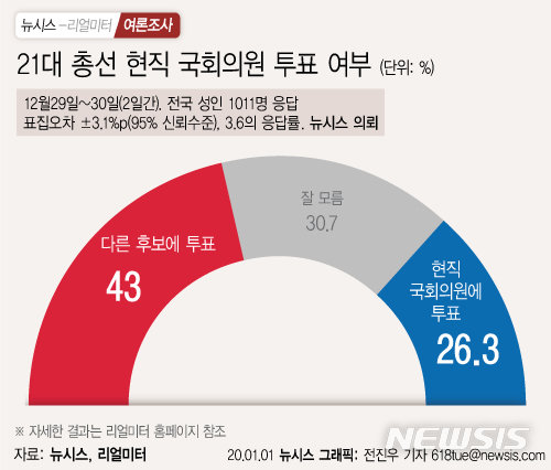 앞서 뉴시스가 여론조사 전문기관 리얼미터에 의뢰해 지난 1일 공개한 ‘2020 신년특집 국민여론 조사’ 결과에 따르면, 현직 의원에게 투표하겠다는 응답은 26.3%에 불과했다. 이는 다른 후보에게 투표하겠다는 응답이 43.0%인 것을 감안하면 매우 낮은 수치다. 잘 모르겠다는 응답은 30.7%였다.
