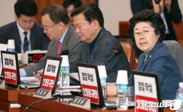 이은재 자유한국당 의원이 10일 서울 여의도 국회에서 열린 법제사법위원회에서 더불어민주당 의원들과 법무부장관이 불출석한 상황에서 검찰인사에 관한 발언을 하고 있다. 2020.1.10/뉴스1 © News1
