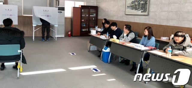 대구통합공항 이전지 결정을 위한 경북 군위·의성 주민투표가 실시된 21일 오전 군위군 군위읍 제4투표소에서 선거관리위원회 관계자와 참관인들이 지켜보는 가운데 주민들이 투표를 하고 있다. © News1