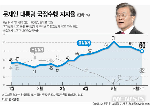 한국갤럽은 6월2주차(9~11일) 대통령 직무수행 평가 결과, 응답자의 60%가 긍정 평가했다고 답했다고 12일 밝혔다. 전주 대비 2%포인트 빠진 수치다.