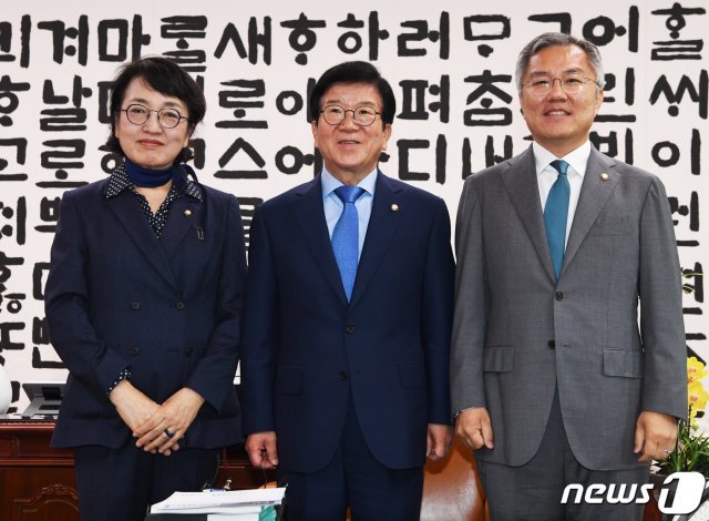 최강욱 열린민주당 대표(오른쪽)과 김진애 원내대표가 지난 9일 박병석 국회의장을 예방, 기념촬영을 하고 있다. © News1