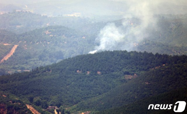 16일 오후 경기도 김포시 애기봉 전망대에서 바라본 북한 개풍군 방향에 연기가 나고 있다. 정부와 군 소식통 등에 따르면 이날 오후 개성공단 지역에서 폭음 소리와 함께 연기가 목격됐다. 북한은 개성공단 남북 연락사무소를 폭파하겠다고 발표한 바 있다. 2020.6.16/뉴스1 ⓒ News1