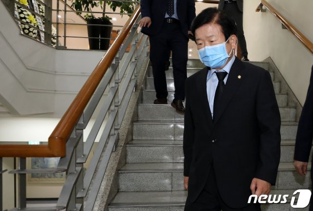 박병석 국회의장이 18일 오후 서울 종로구 서울대학교병원 장례식장에 마련된 고(故) 홍사덕 전 국회부의장 빈소에서 조문을 마친 뒤 장례식장을 나서고 있다. 2020.6.18 © News1