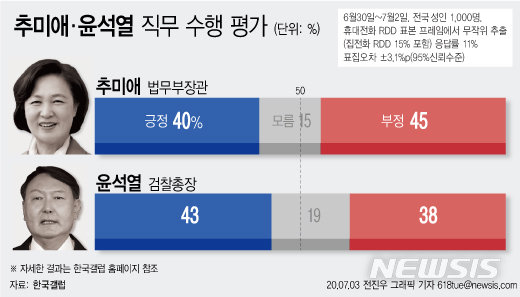 한국갤럽은 이번 조사에 대해 “추 장관과 윤 총장에 대한 직무 평가는 개별 사안에 대한 생각이 아니다”며 “법무부·검찰 등 그들이 이끄는 조직에 대한 평가로 확대 해석할 수 없음에 주의해야 한다”고 설명했다.