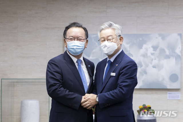 더불어민주당 차기 당 대표에 도전한 김부겸 전 의원이 27일 이재명 경기도지사를 만났다. 두 사람 모두 이낙연 의원과 서로 다른 트랙에서 경쟁 구도를 형성하고 있다는 점에서 이날 회동은 적잖은 관심을 모았다. 이 의원은 당 대표 자리를 두고는 김 전 의원과, 차기 여권 대선 후보 자리를 놓고는 이 지사와 경쟁하고 있다.