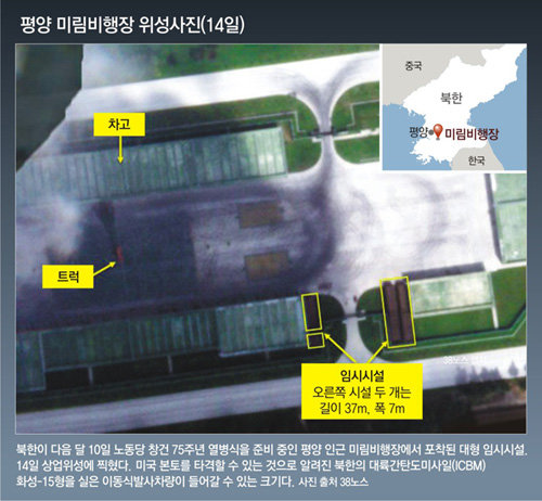 평양 인근 미림비행장에서 정체불명의 대형 임시 보관시설이 발견되면서 북한이 다음 달 노동당 창건일(10월 10일) 열병식에서 대륙간탄도미사일(ICBM) 같은 핵심 전략무기를 선보일지에 관심이 쏠리고 있다.
