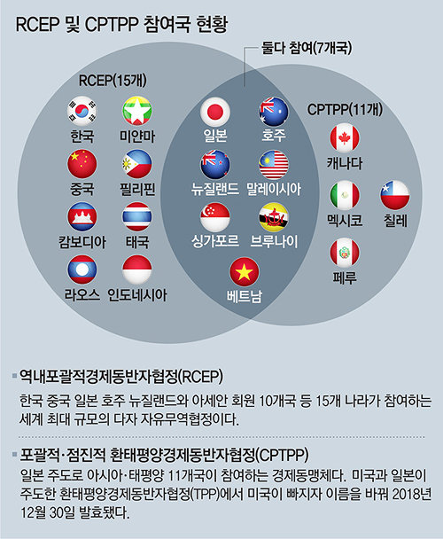 특히 문 대통령은 시진핑(習近平) 중국 국가주석이 CPTPP 가입 의사를 밝힌 것에 대해 “상당히 주목을 받고 있다”며 “우리 정부도 좀 더 전향적으로 통상전략을 만들어야 한다”고 말했다고 한다. 시 주석은 지난달 열린 주요 20개국 정상회의(G20)에서 CPTPP 가입 의지를 밝힌 바 있다. 한 참석자는 “중국이 현실적으로 CPTPP에 가입할 수 있을지는 모르지만 우리도 끌려가지만 말고 우리만의 전략을 수립해야 한다는 취지로 이해했다”고 말했다. 또 다른 참석자는 “문 대통령이 RCEP 협정 타결로 우리의 통상전략이 중국 일변도로 비치는 것에 대해 아쉬워하는 것 같았다”고 했다.
