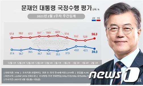 여론조사 전문회사 리얼미터가 YTN 의뢰로 지난 1일~5일 전국 유권자 2519명을 대상으로 실시해 8일 공개한 2월1주차 주간집계 결과, 문 대통령의 취임 196주차 국정수행 긍정평가는 전주 대비 3.2%포인트(p) 내린 39.3%로 나타났다. ‘매우 잘함’은 22.3%, ‘잘하는 편’은 16.9%다.