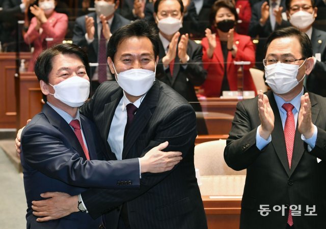 국민의힘 오세훈 서울시장 후보가 24일 서울 여의도 국회에서 열린 의원총회에서 안철수 공동선대위원장과 포옹하고 있다. 오른쪽은 주호영 원내대표. 사진공동취재단