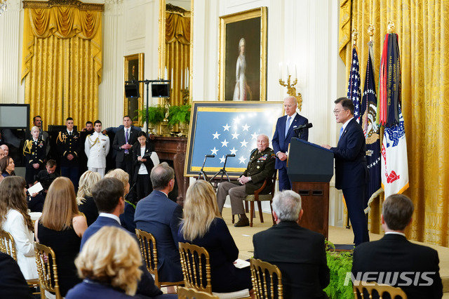 정상회담 직전 문 대통령은 백악관에서 열린 6·25전쟁 참전용사인 랠프 퍼킷 주니어 예비역 대령(95)의 명예훈장 수여식에도 참석했다. 미군 최고 훈장인 명예훈장 수여식에 외국 정상이 참석한 건 처음이다 청천강 일대에서 중공군에 맞서 싸웠던 퍼킷 대령과 함께 입장한 조 바이든 대통령은 “한국 국민들은 잊지 않았다. 그 증거로 이 자리에 한국 대통령이 함께 계신다”고 말했다.