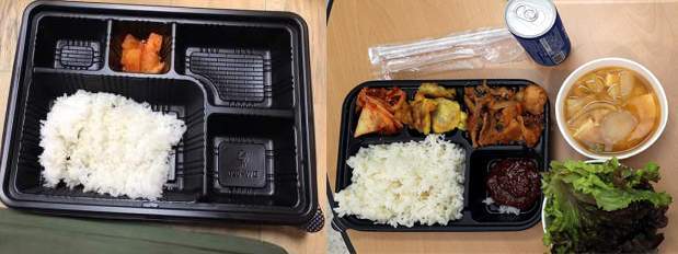 휴가를 다녀와 코로나 19 예방차원에서 격리중인 장병에게 배급된 부실 도시락(왼쪽), 27일 여당대표가 방문한 날 격리중인 장병들에게 배급된 도시락. 국회사진기자단