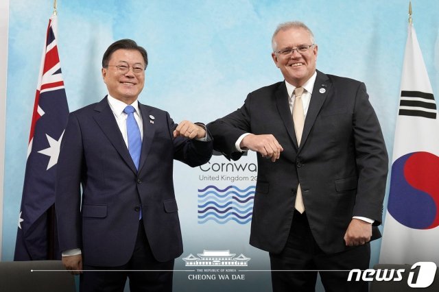 문 대통령은 이날 오전 10시부터 47분간 영국 콘월 시내에 있는 한 호텔에서 스콧 모리슨 호주 총리와 정상회담을 갖는 것으로 첫날 일정을 시작했다. 문 대통령이 지난 2018년 8월 취임한 모리슨 총리와 정상회담을 개최한 것은 이번이 세 번째다.