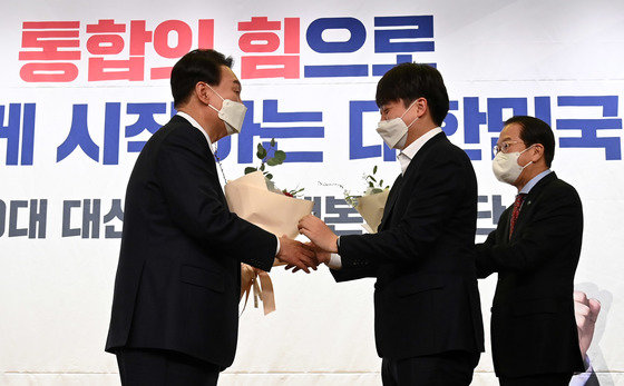 윤석열 대통령 당선인이 10일 오후 서울 여의도 국회 도서관에서 열린 국민의힘 대선 선거대책본부 해단식에서 이준석 대표와 권영세 총괄선대본부장으로부터 꽃을 전달받고 있다. 2022.3.10/뉴스1