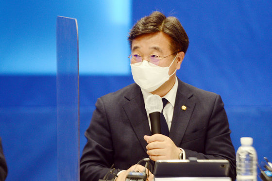 윤호중 더불어민주당 비상대책위원장이 16일 오후 광주 광산구 빛그린산단 광주글로벌모터스(GGM) 캐스퍼 생산 공장에서 열린 ‘광주형 일자리 시즌2’ 회의에서 발언을 하고 있다. 2022.3.16/뉴스1 © News1