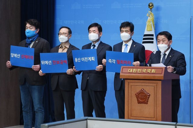 국회 국방위원회 소속 민주당 의원들은 17일 국회에서 기자회견을 열고 “윤 당선인은 아집을 버리고 국민을 기만하는 것을 즉각 중단하길 바란다”며 △안보 공백 △국민과의 소통 단절 △인근 주민 기본권 침해 △과도한 이전 비용을 들어 이전을 반대했다. 이들은 “집무실 졸속 이전 추진은 전형적인 대통령발 갑질”이라며 “국방부와 합참의 많은 부서와 시설본부, 국방부 근무지원단 등이 모든 업무를 중지하고 3월 말까지 이사를 해야 한다. 이들 부대 이전에 따른 직간접적인 예산이 1조 원 이상 소요될 것”이라고 비판했다.