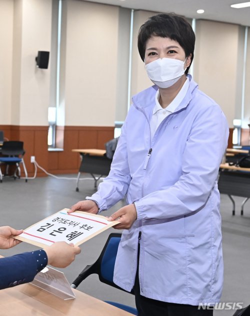 김은혜 국민의힘 후보는 이날 오전 10시께 수원시 영통구 경기도선거관리위원회를 찾아 준비해온 서류를 선관위 직원에게 전달했다.