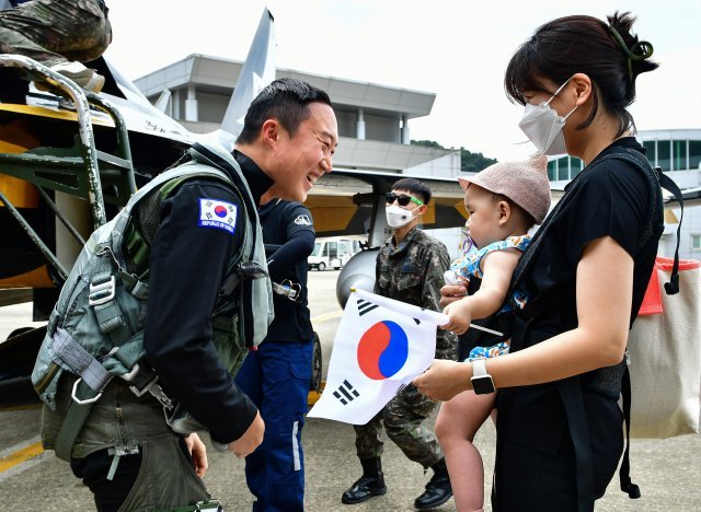 공군 특수비행팀 블랙이글스가 20일 군사외교 및 방산협력을 위한 해외에어쇼 임무를 성공적으로 마치고 무사귀환했다. 한 조종사가 마중나온 가족들과 재회하고 있다. 공군 제공