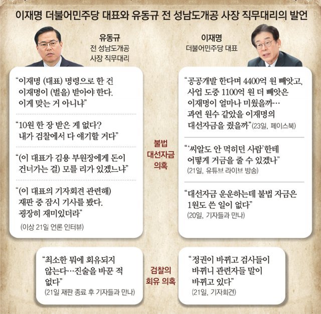유 전 직무대리는 이 대표가 2010년 성남시장에 당선된 뒤 성남도시개발공사 기획본부장과 사장 직무대리 등을 맡았고, 2018년 이 대표가 경기도지사에 당선되자 경기관광공사 사장으로 옮기는 등 승승장구했다. 하지만 이 대표는 지난해 대장동 의혹이 불거지자 유 전 직무대리를 두고 “측근이 아니다”라며 선을 그었다. 이 때문에 배신감을 느낀 유 전 직무대리가 태도를 바꾼 것이란 분석이 나온다. 유 전 직무대리는 언론에 “회유? 협박? 구역질 난다”며 “의리? 그런 게 없더라. 착각하고 살았던 것 같다”고도 했다.