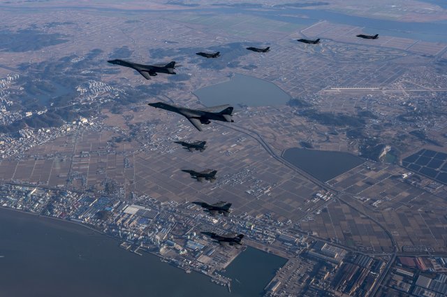 미군의 전략폭격기 B-1B 랜서와 미군의 F-16 전투기, 한국 공군의 스텔스기인 F-35A가 5일 한반도 상공에서 비행하고있다. 합참 제공전략폭격기 B-1B 랜서는 길이 44.5미터, 폭 41.8미터, 무게 86톤으로 최고속도가 마하 1.2에 달한다. 기체 내부에 34톤, 외부에 27톤의 폭탄과 미사일을 탑재할 수 있으며 괌에서 출격해 2시간이면 한반도에 도달할 수 있다.