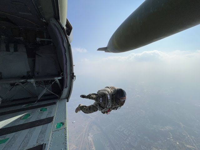 경기도 하남시 특전사 고공훈련장에서 열린 ‘제44회 특수전사령관배 고공강하 경연대회’에 참가한 장병들이 UH-60 헬기에서 강하하고 있다. 국방일보 제공 대한민국 육군 특전요원들의 고공강하 능력은 지난 6월 오스트리아에서 개최된 제45회 세계군인 강하선수권대회에서 여군 상호활동 1위, 정밀강하 단체전 3위 등 종합 2위를 수상했다.