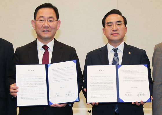 주호영 국민의힘 원내대표와 박홍근 더불어민주당 원내대표가 23일 서울 여의도 국회에서 이태원 참사 국정조사 실시 관련 합의문을 들어보이고 있다. 2022.11.23 뉴스1